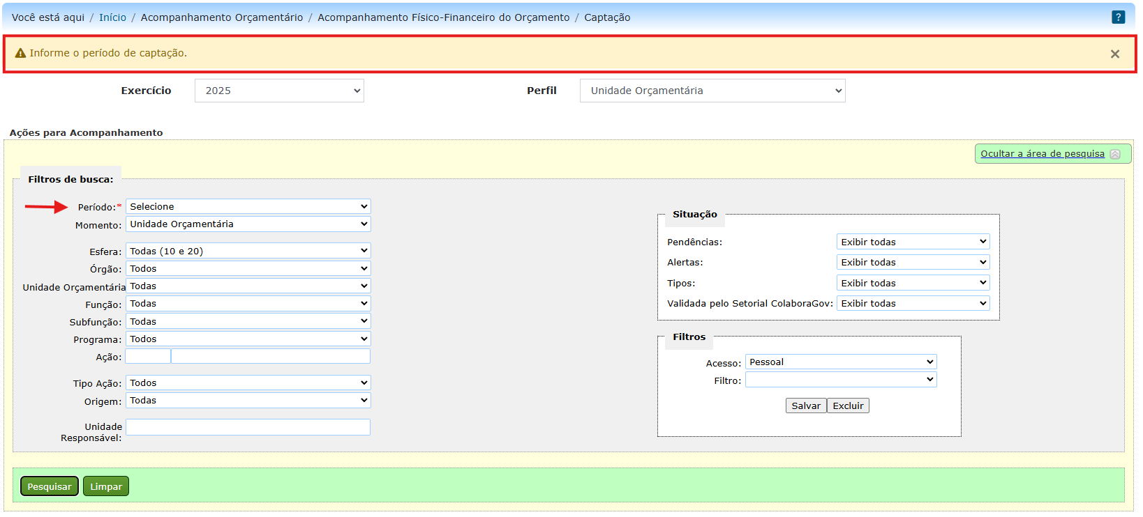 Com o Perfil Unidade Orçamentária, os usuários poderão realizar captações apenas quando as Ações estiverem no momento Unidade Orçamentária. Da mesma forma, os usuários com perfil Órgão Setorial poderão realizar captações quando as Ações estiverem no momento Órgão Setorial.