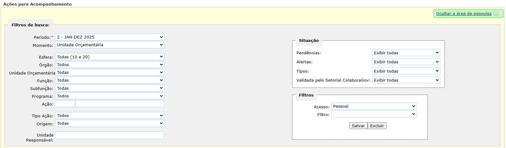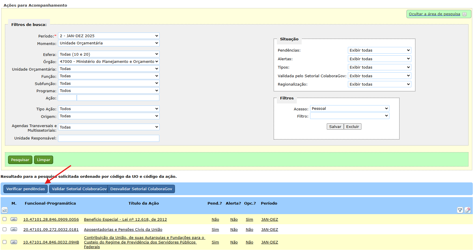 Observe que é possível, no momento da pesquisa, filtrar de modo a apenas “Exibir ações não validadas pelo Órgão Setorial” ou apenas “Exibir ações validadas pelo Órgão Setorial”. Isso é feito por meio do campo “Validação pelo Órgão Setorial” na caixa de filtro “Situação”, conforme destacado na tela acima. Por padrão, o sistema traz inicialmente esse campo preenchido com a opção “Exibir todas”.