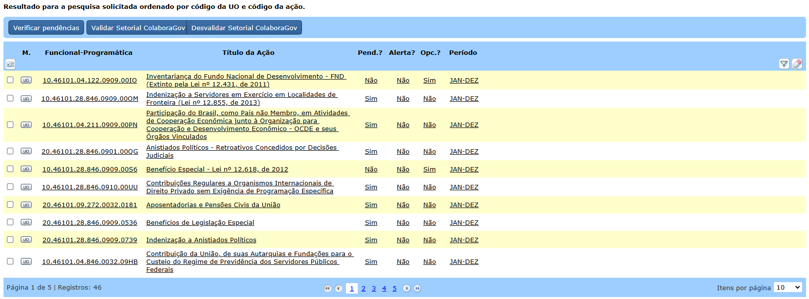 Essa validação visa a auxiliar no controle de quais ações recebidas das UOs já foram analisadas pelo Órgão Setorial. Trata-se, portanto, de uma fase de “homologação” das ações pelo Órgão Setorial, de forma que eles possam marcar aquelas já analisadas, até que seja habilitado o envio para Formalização.