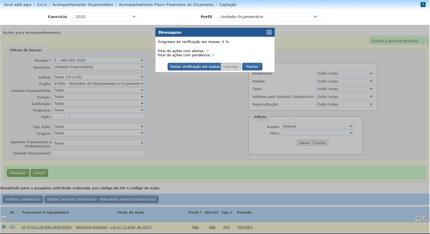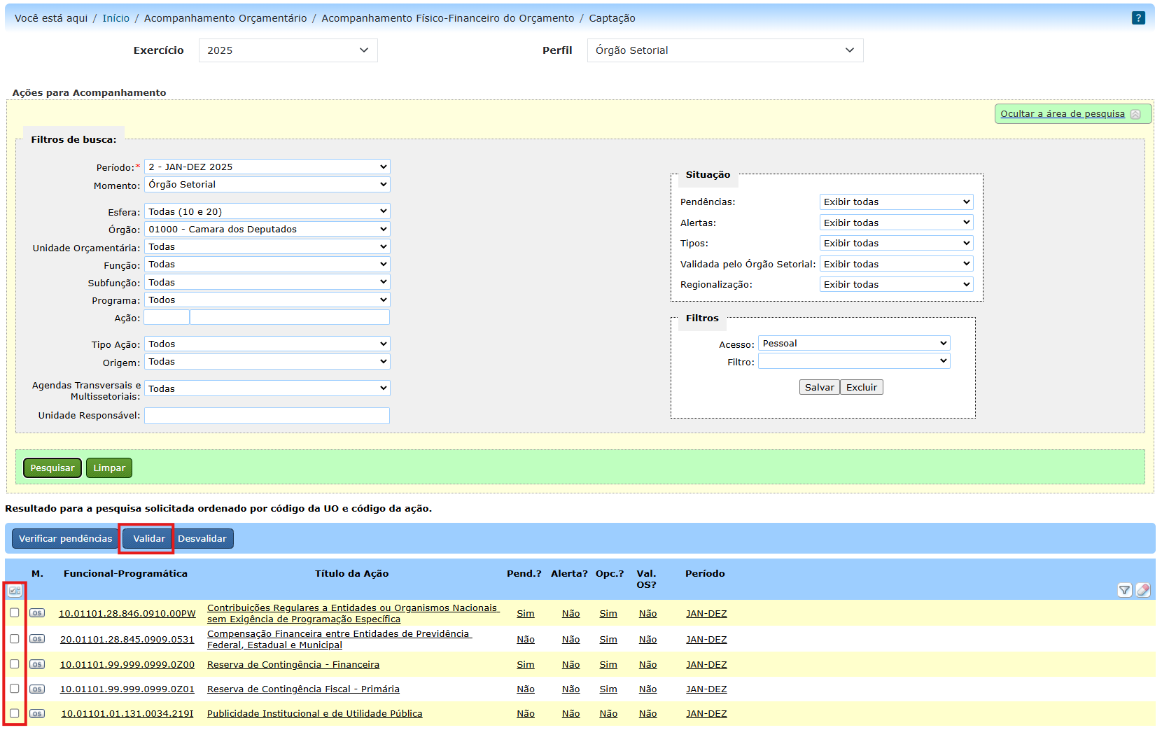 Em “Ações para acompanhamento”, realizar a pesquisa das ações do órgão que estejam no momento “Órgão Setorial”. Em seguida, em “Resultados para a pesquisa solicitada” marcar aquelas que já foram verificadas e clicar no botão “Validar”.