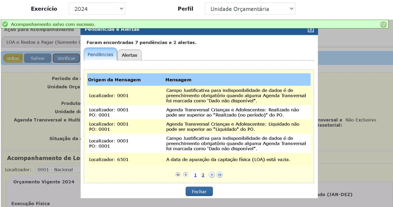 b. Será aberta uma janela com a listagem de pendências e alertas referentes à ação, caso existam.
