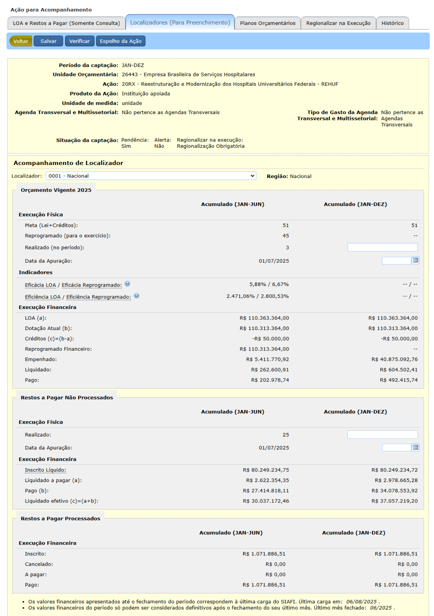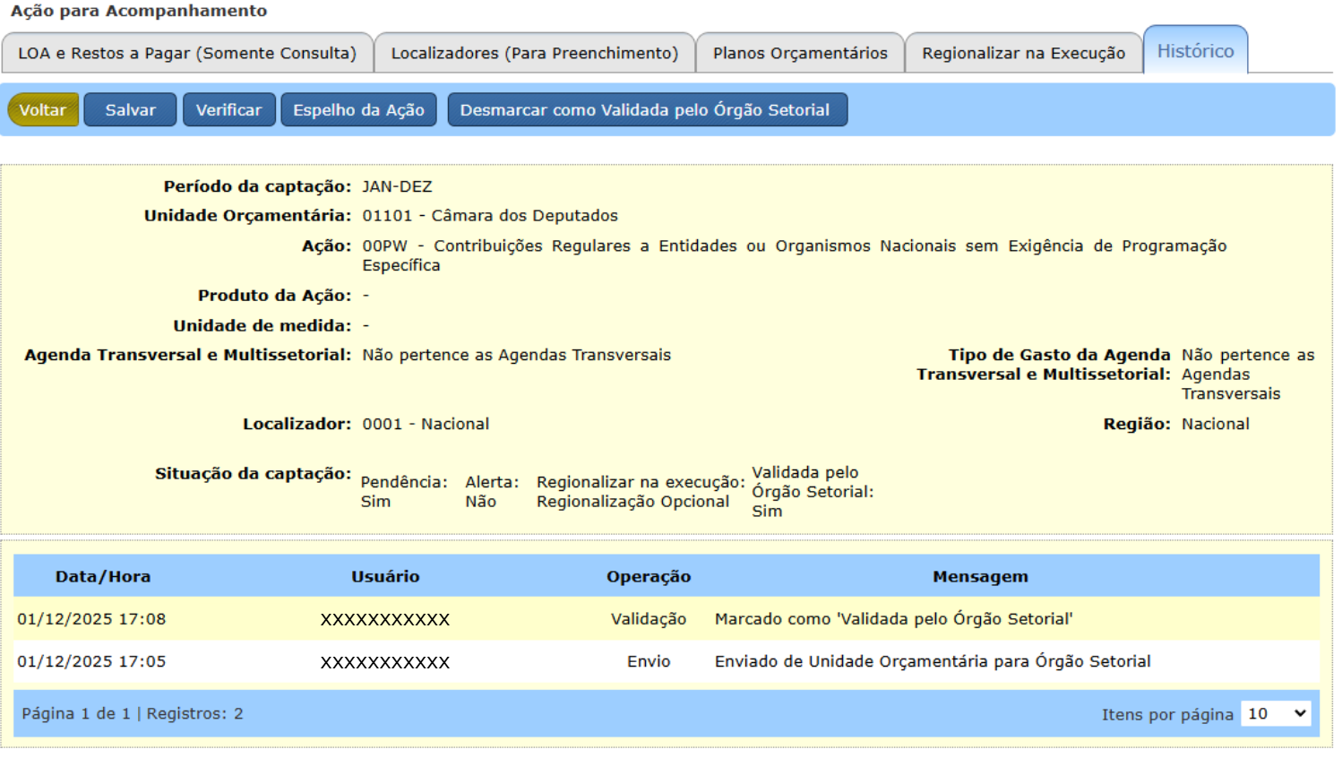 • Formalização Acompanhamento Orçamentário: os dados da captação validados pelo OS e foram enviados e estão disponíveis nos relatórios. Não há edição neste momento.