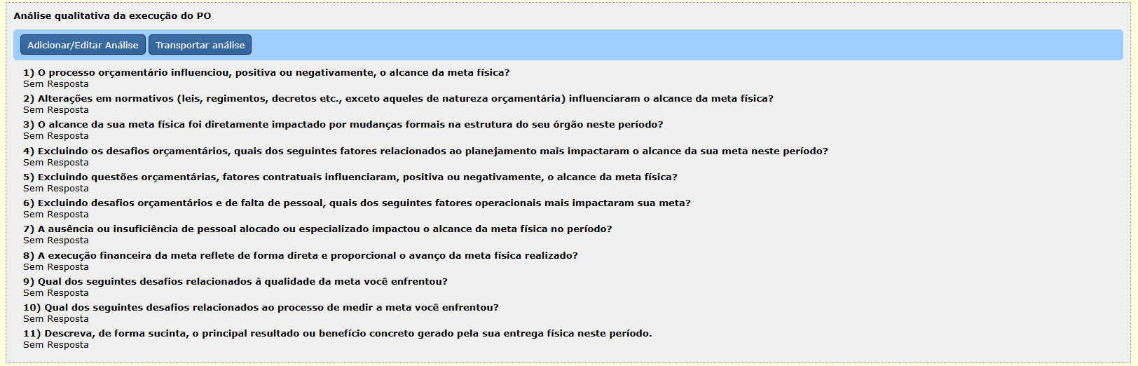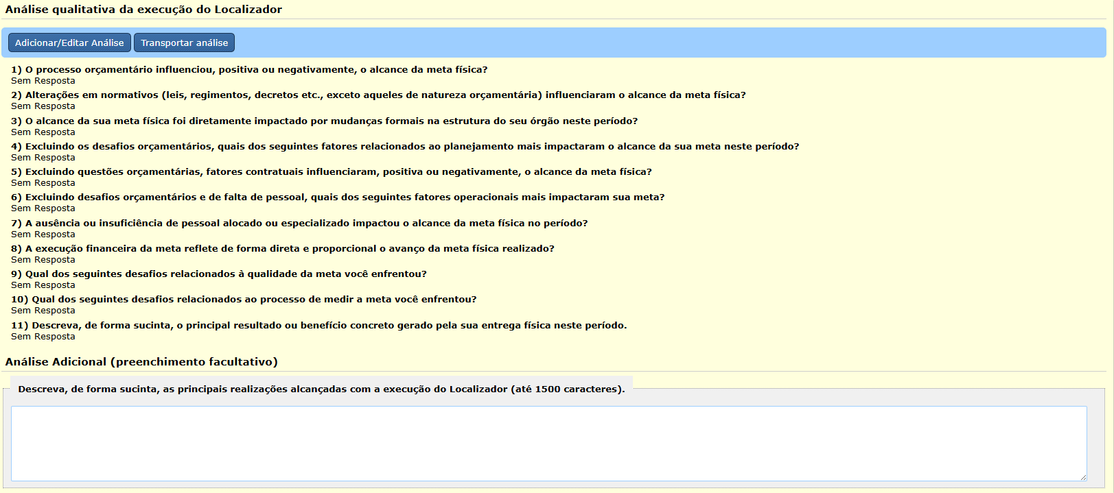 Para preencher o questionário, o usuário deverá clicar no botão “Adicionar/Editar Análise”, selecionar as respostas e salvar. A análise salva pode ser transportada para os planos orçamentários ou para outros localizadores da mesma ação. Opcionalmente, o usuário pode preencher o campo “Análise Adicional”, caso o questionário não seja suficiente para os esclarecimentos a serem prestados, relativos ao alcance das metas no período.