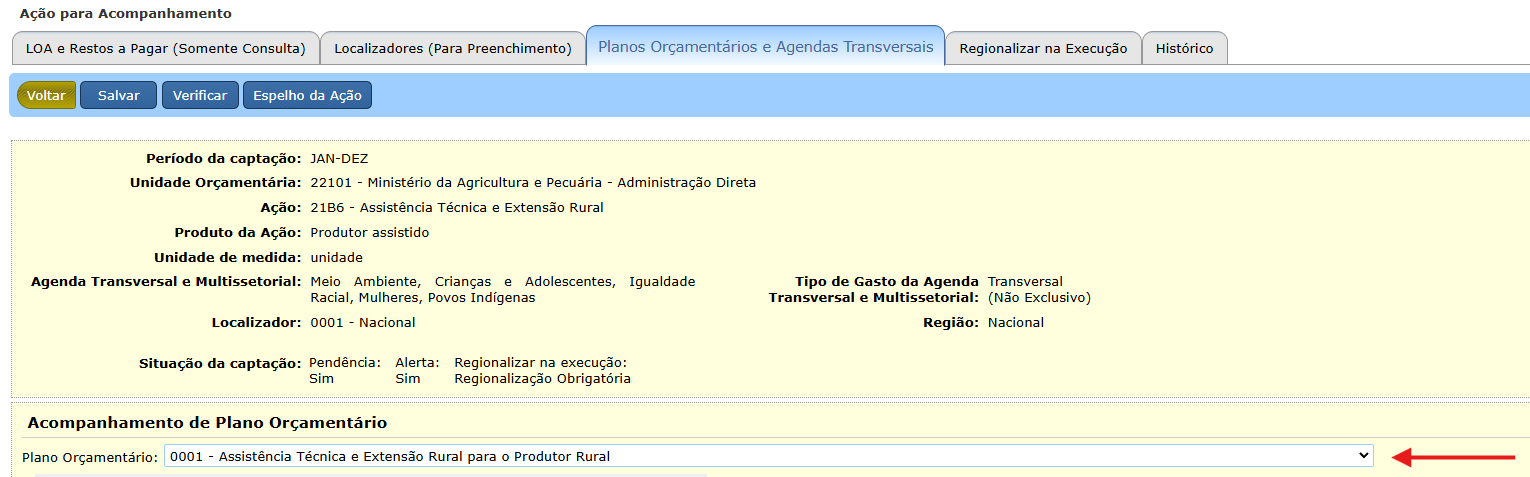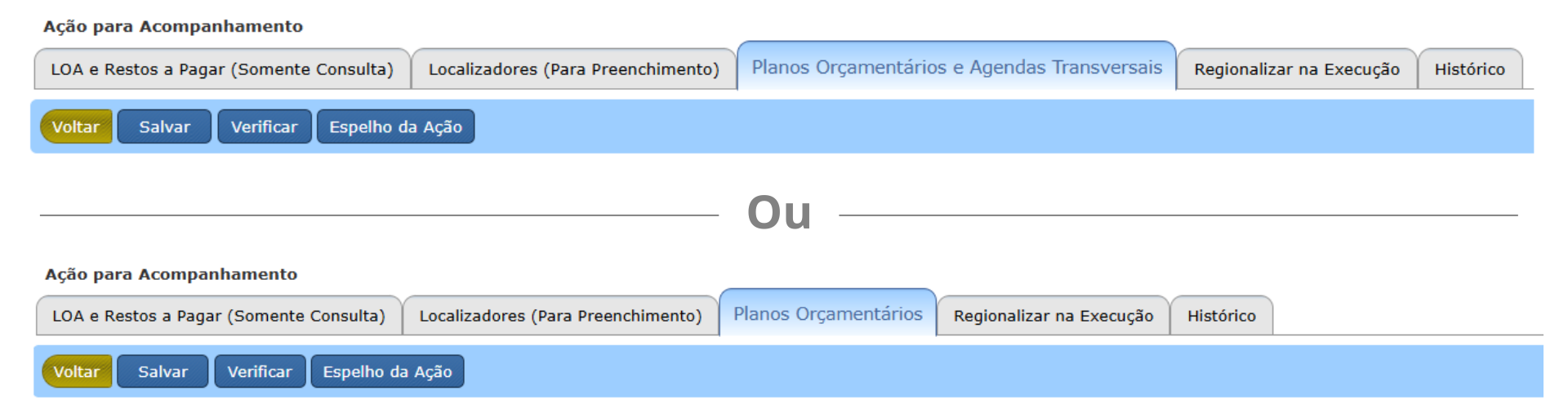 • Exibirá “Planos Orçamentários e Agendas Transversais” somente se a ação selecionada possuir agendas vinculadas.