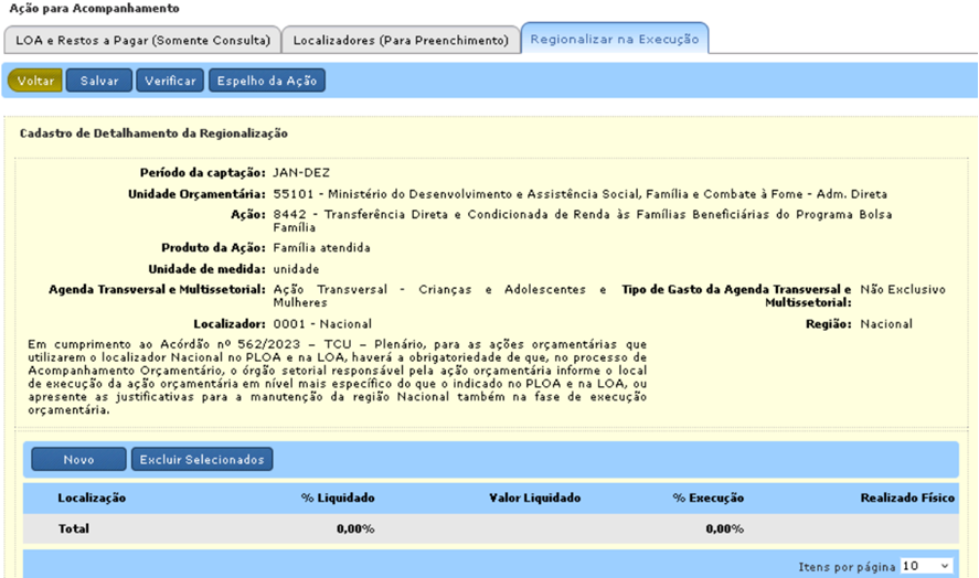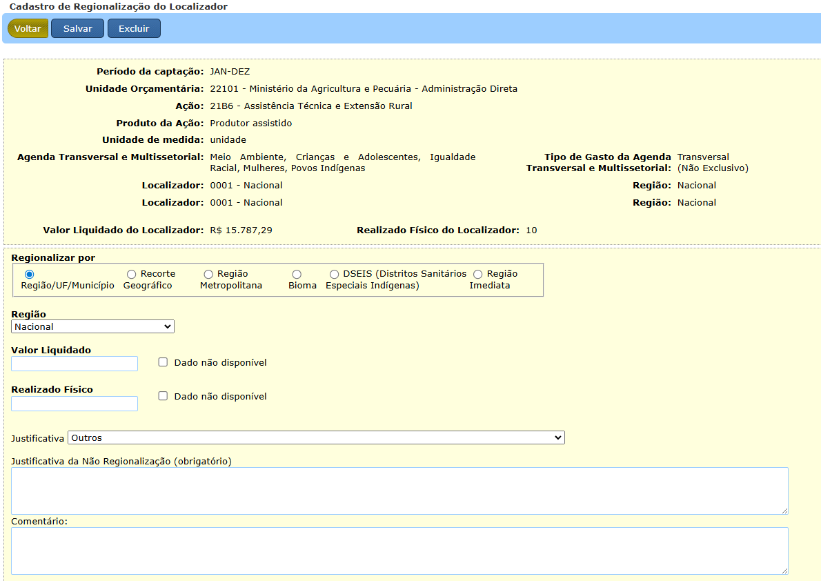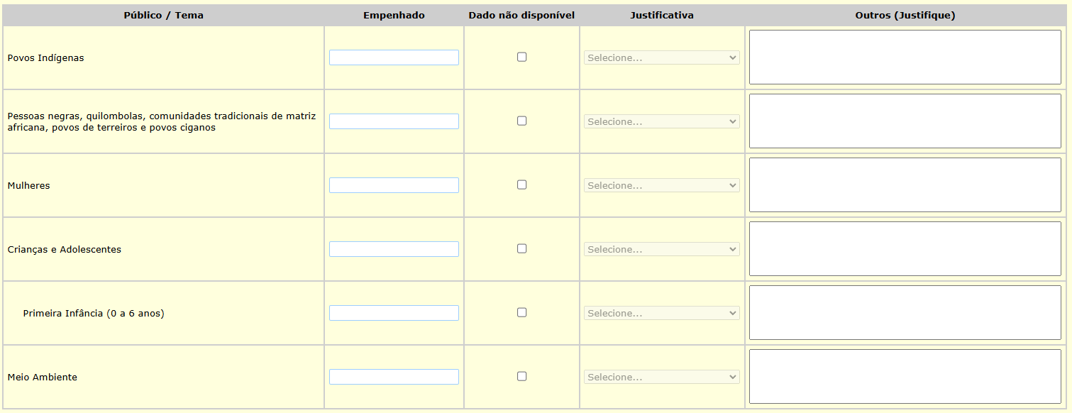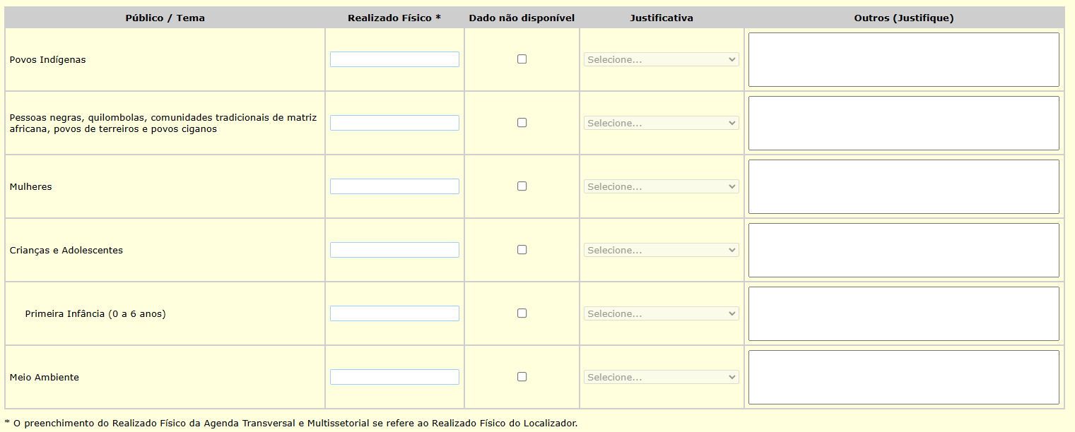 • O preenchimento está habilitado nos Localizadores de ação com produto ou PO com produto ou ainda PO com ou sem produto vinculados a ações que pertençam a Agendas Transversais e Multissetoriais.