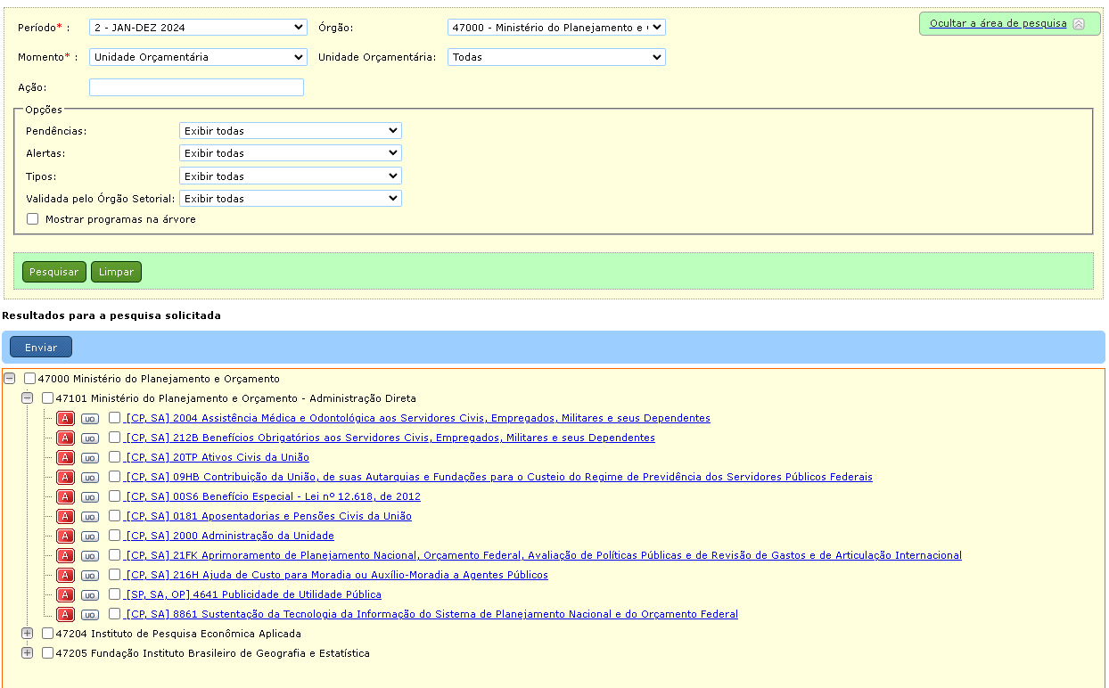 • Enviar: envia as Ações do momento “Órgão Setorial” para o momento “Formalização Acompanhamento Orçamentário”.