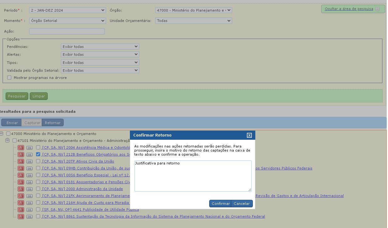 • Retornar: retorna as Ações do momento “Órgão Setorial” para o momento “Unidade Orçamentária”. Salienta-se que, nesse caso, todas as alterações da programações realizadas para fins de acompanhamento físico-financeiro serão perdidas, retornando ao estágio inicial para novo preenchimento da captação.