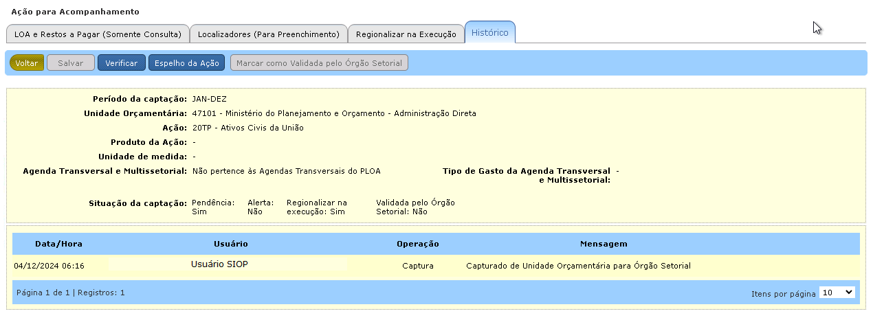 • Capturar: captura as Ações do momento “Unidade Orçamentária” para o momento “Órgão Setorial”.