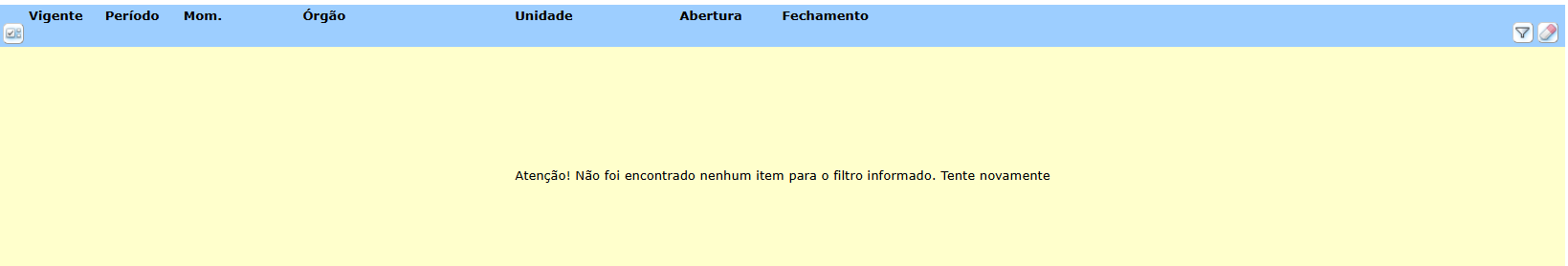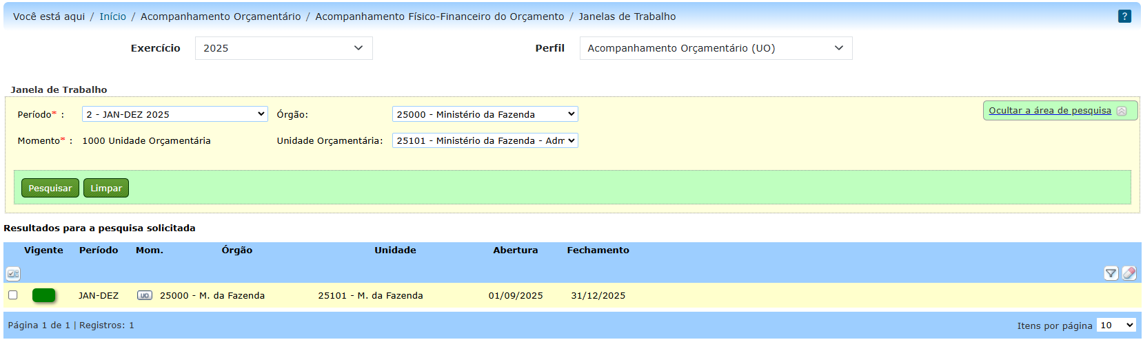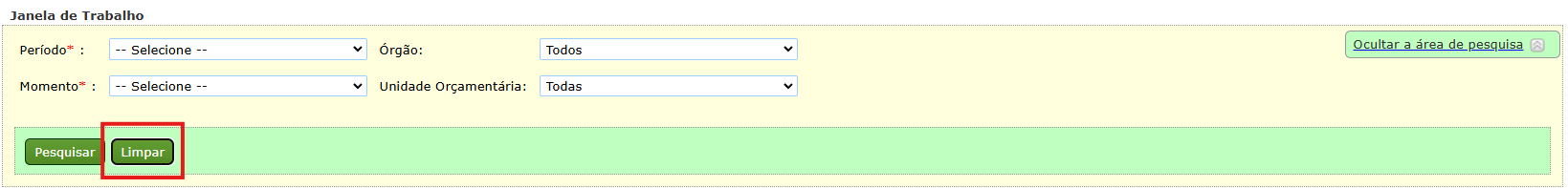 Ao acessar o item de menu Janelas de Trabalho, é exibida a tela de pesquisa abaixo. Selecione/preencha os campos: Período (obrigatório), Momento (obrigatório), Órgão (opcional) e Unidade Orçamentária (opcional), e clique no botão “Pesquisar”: