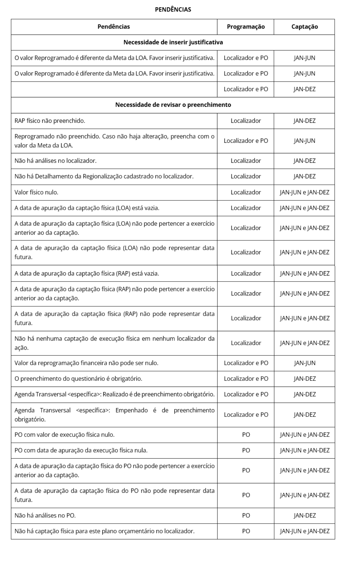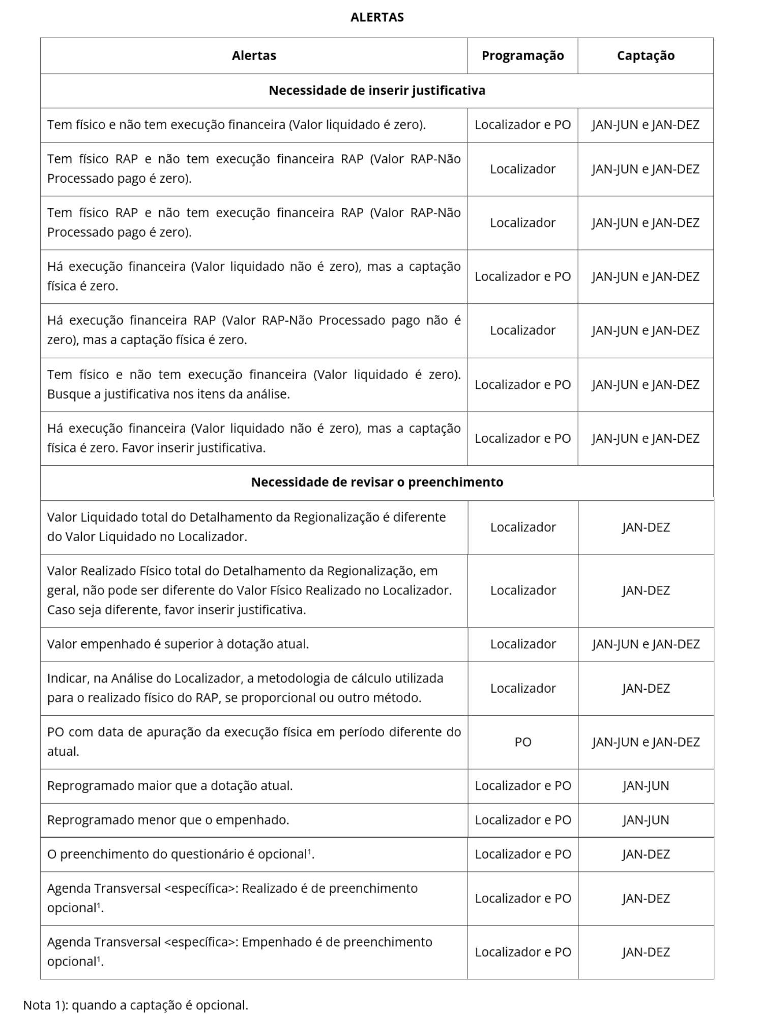Importante destacar que, naquelas programações que forem consideradas de captação opcional (regras 3.2.2 a 3.2.5 do Orientador do Acompanhamento Físico-Financeiro do Orçamento), todas as pendências se tornam alertas.
