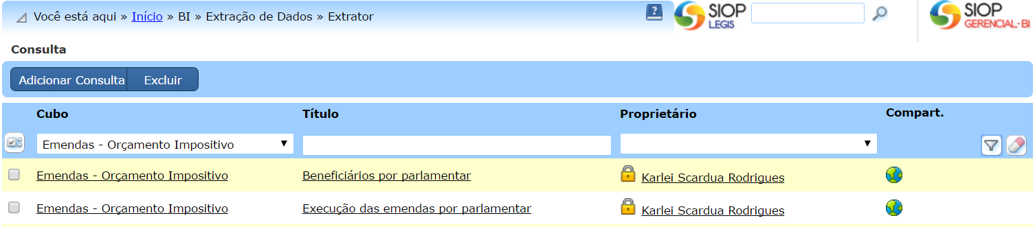 Porém, especificamente para o acompanhamento das emendas individuais, disponibilizamos para todos os usuários duas consultas pré-formatadas para facilitar a utilização pelos novos na ferramenta.
