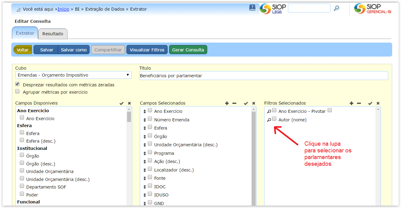 Em ambos os casos, antes de solicitar a execução da consulta, é fundamental alterar o filtro de “Autor” da emenda, que por definição foi criado inicialmente vazio. Para isso, clique na lupa ao lado do campo “Autor” na área de filtros da consulta.