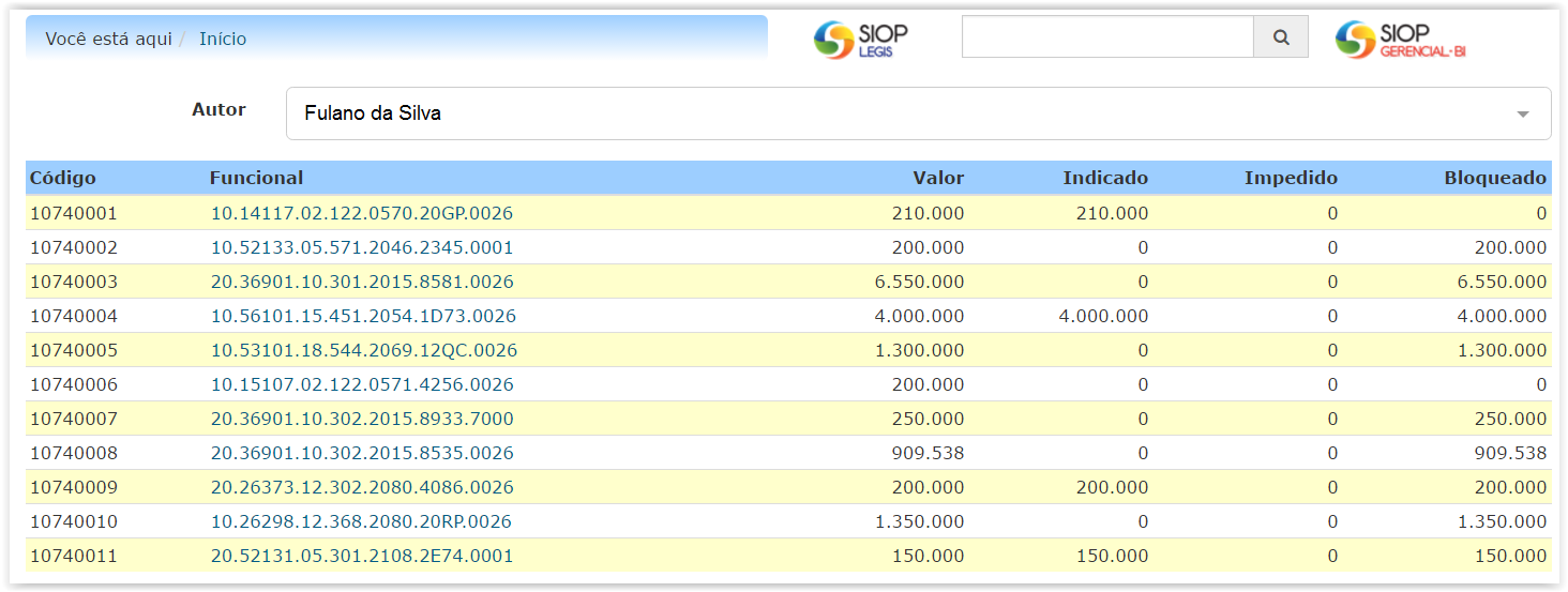 | Valor | Valor total atribuído para a emenda na LOA |