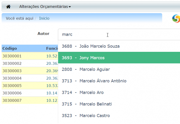 À medida em que o dado vai sendo digitado, os parlamentares que se encaixam nos dados vão sendo apresentados para seleção.