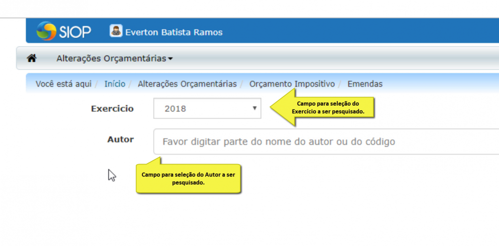 O usuário que possui apenas um parlamentar associado ao seu perfil enxergará automaticamente a lista com as suas emendas.