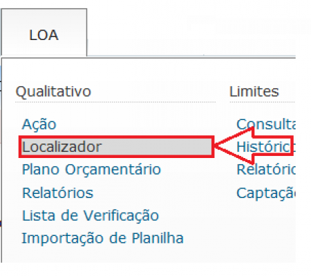O acesso à funcionalidade Manter Localizador se dá via item de menu (LOA » Qualitativo » Localizador), conforme imagem abaixo: