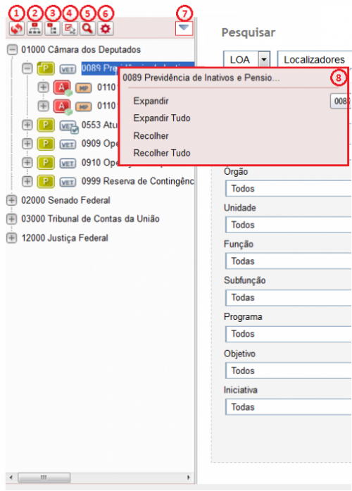 ( 8 ) → Menu de contexto. Clique de mouse no botão esquerdo. Disponibiliza ao usuário um conjunto de ações possíveis de serem executadas com os itens da árvore.