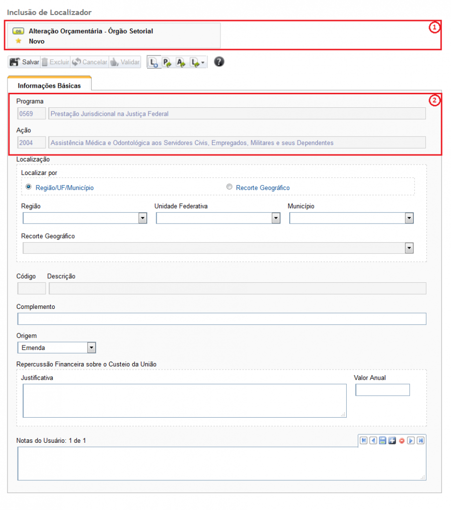 ( 2 ) → Botão para a inclusão de novo Localizador para o Programa/Ação;