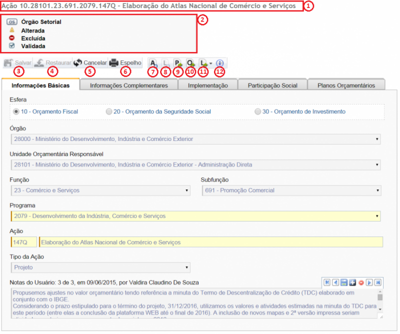 3. Barra de Botões: indica as operações possíveis de serem executadas com a ação. No exemplo acima as opções são: Salvar, Restaurar, Cancelar, Espelho, Incluir Nova Ação, Incluir Novo Localizador, Ir para o programa, Ir para o objetivo, Ir para os localizadores e Visualizar histórico