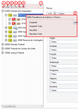 • 7 - Menu de ações. Disponibiliza ao usuário um novo conjunto de ações possíveis de serem executadas com os itens da árvore. Para que o usuário consiga executar a operação com sucesso há que ter permissão cadastrada.