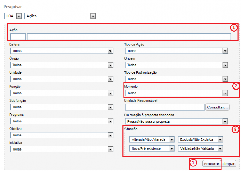 • Ação: campo que irá permitir o filtro pelo código ou título da ação. Pode ser feita pesquisa por parte do código ou título