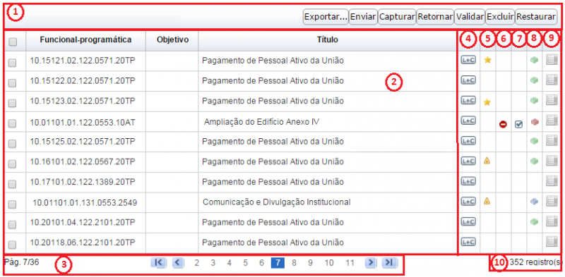 • 1 - Área para seleção de registros. Permite a execução de operações (listadas na barra de botões) em massa