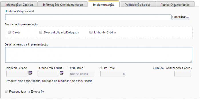 Os campos “Início mais cedo”, “Término mais tarde”, “Total Físico”, “Custo Total” e “Qtde de Localizadores Ativos” aparecerão apenas para ações do tipo Projeto. Esses campos são apenas de leitura, uma vez que os dados são preenchidos automaticamente pelo sistema com base nas informações dos Localizadores.