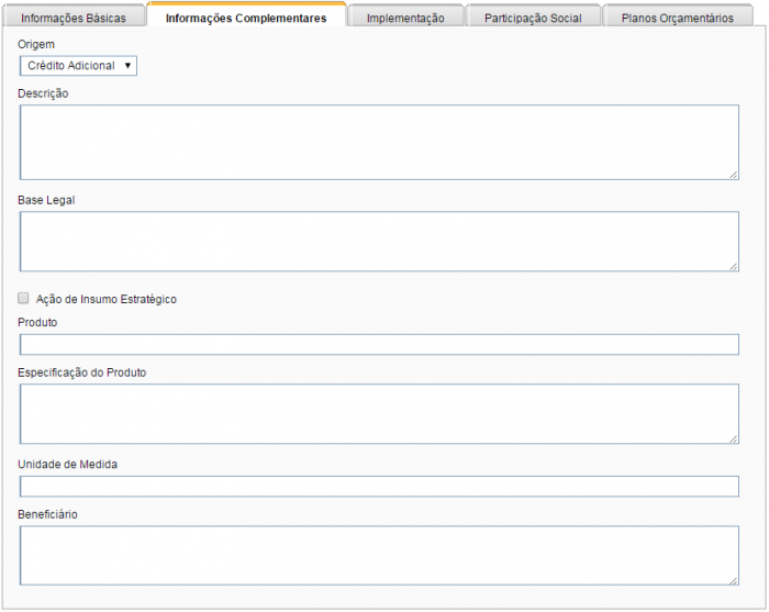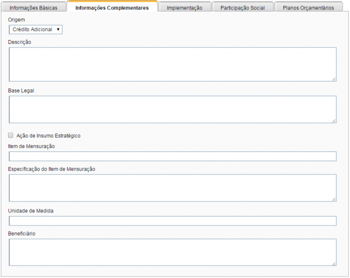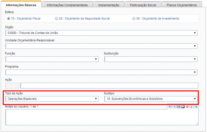 Para o tipo de ação “Operações Especiais” será preciso informar um subtipo. Dependendo do subtipo escolhido, a aba “Informações Complementares” solicitará dados de “Item de Mensuração”.