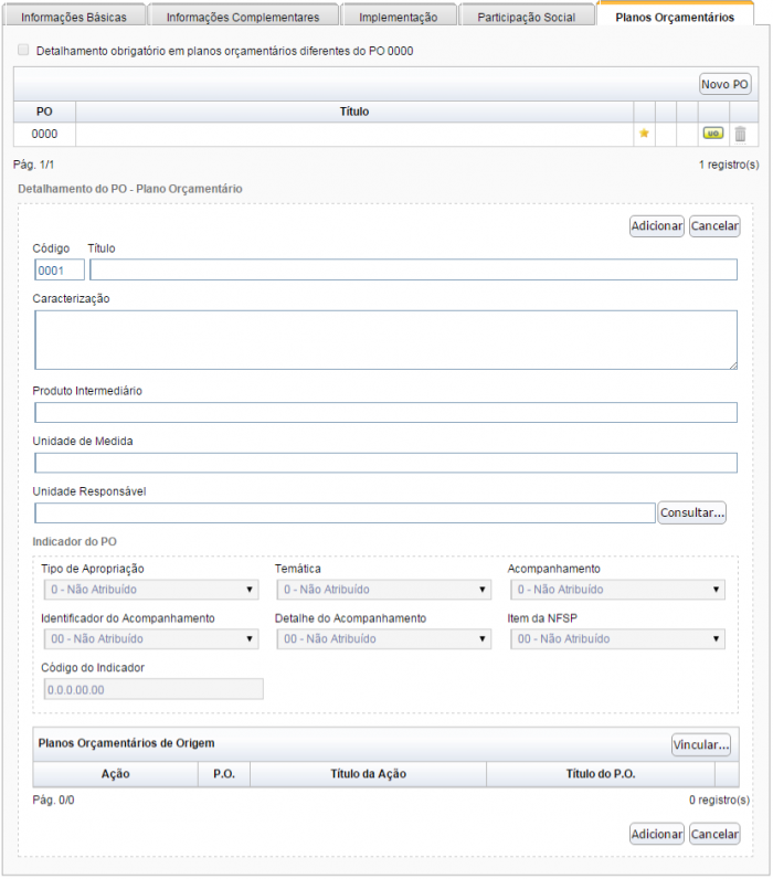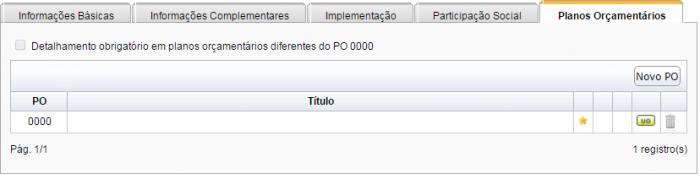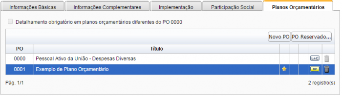 Ao final, a aba “Planos Orçamentários” exibirá todos os POs cadastrados.